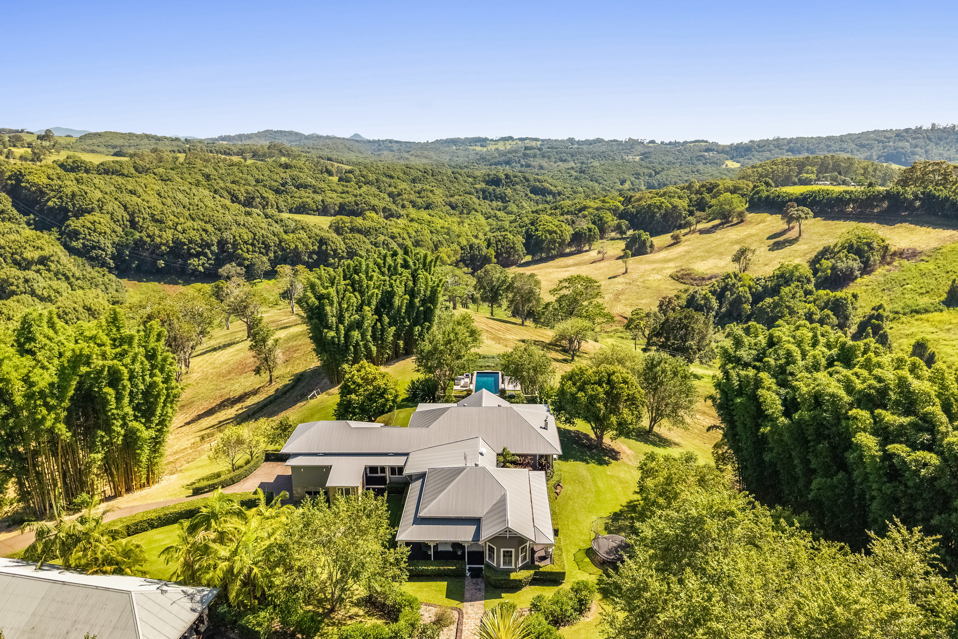 Displaying a picture of excellence and an elevated benchmark for luxury and sophistication, this superbly renovated and extended 1920s character home is a super-private oasis on a sprawling 58-acre estate. An expression of the quintessential Byron hinterland lifestyle, the property celebrates the sensational natural surrounds, and comes complete with a separate guest residence, additional 2-bedroom dwelling, large three-bay machinery shed and a tranquil resort atmosphere.